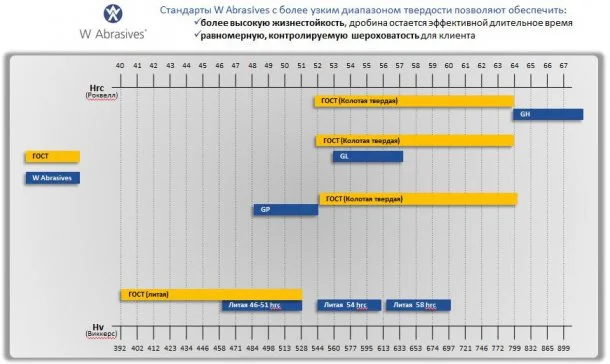 | Дробь стальная колотая WG | WGP | Углерод 0,8-1,2%, Кремний 0,4-1,2%, Марганец 0,6-1,2%, Фосфор ≤ 0,05%, Сера ≤ 0,05% | 48-52 HRC | Согласно ТУ 4196-001-78730722-2010 | ≥ 7,6 | 0,18-2,0 | полностью однородный и мелкозернистый мартенсит |