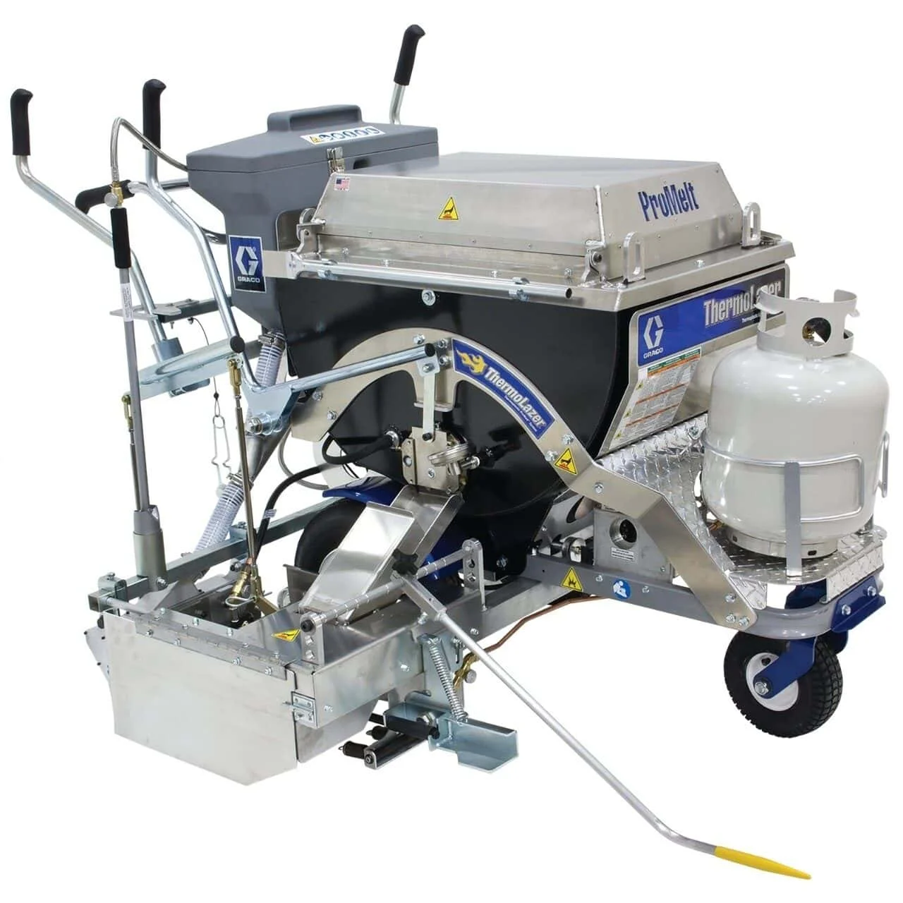 Graco’s ThermoLazer 300TC is one of the most productive and easy to use thermoplastic handliners in the industry. The system—s 300 lb material kettle allows for more striping and less time spent refilling with material, while its EasyGlide Wheel Mount System makes this unit as easy to maneuver as a LineLazer.